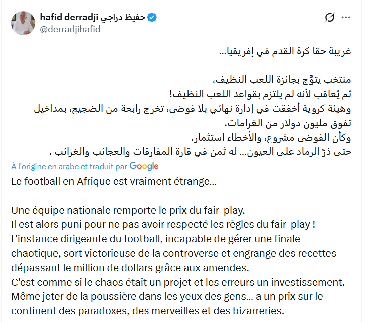 The commentator also denounced the heavy fines imposed on Senegal and Morocco. "The governing body of football, incapable of managing a chaotic final, emerges victorious from the controversy and rakes in over a million dollars in revenue from the fines. It's as if chaos were a project and mistakes an investment. Even throwing dust in people's eyes... has a price on the continent of paradoxes, wonders, and oddities," Derradji concluded.