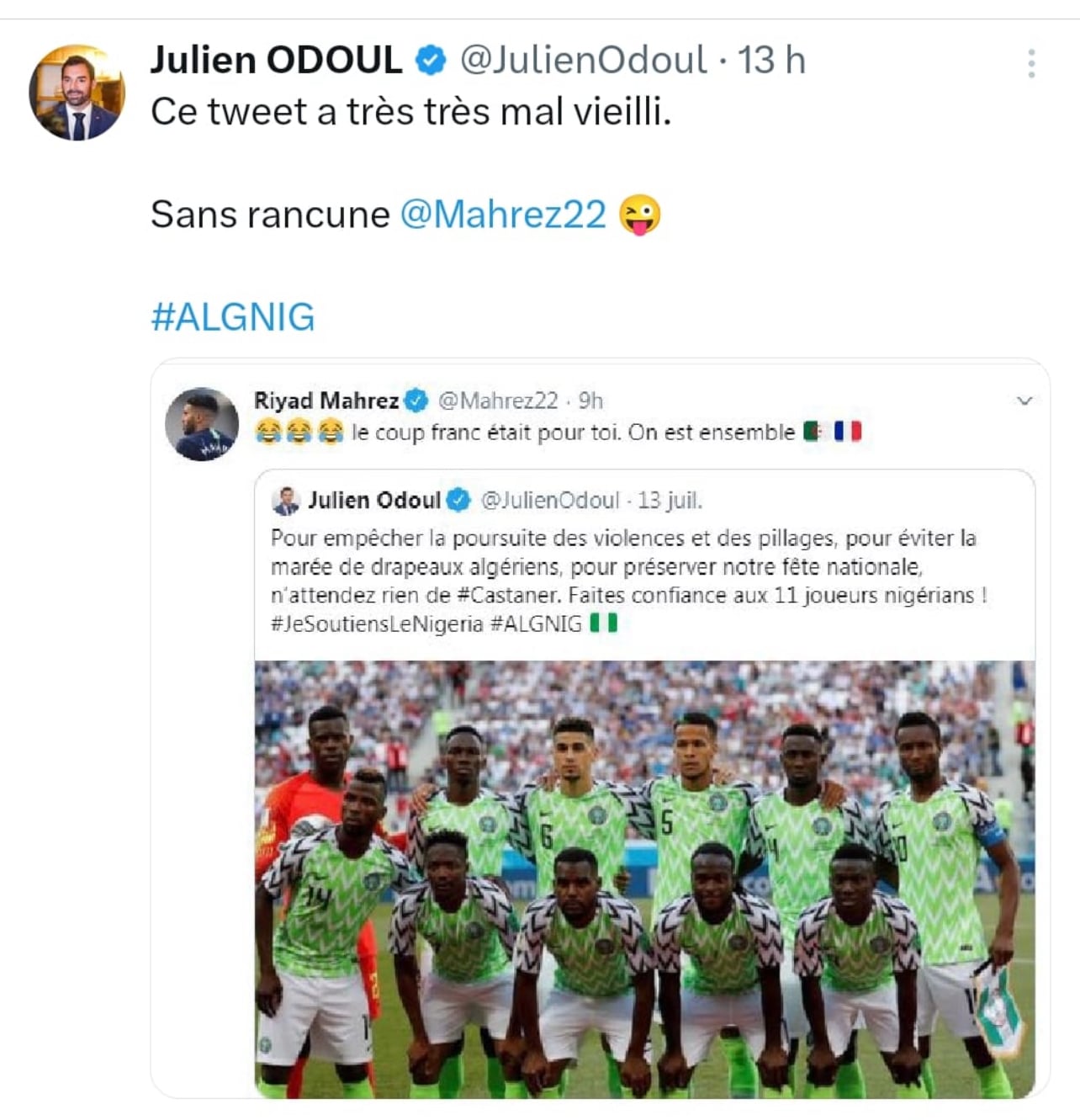L'homme politique a exhumé un ancien échange datant d'une confrontation entre l'Algérie et le Nigeria. À l'époque, Mahrez avait répondu avec ironie à un message de Julien Odoul, qui soutenait l'équipe nigériane pour éviter des débordements lors de la fête nationale française.