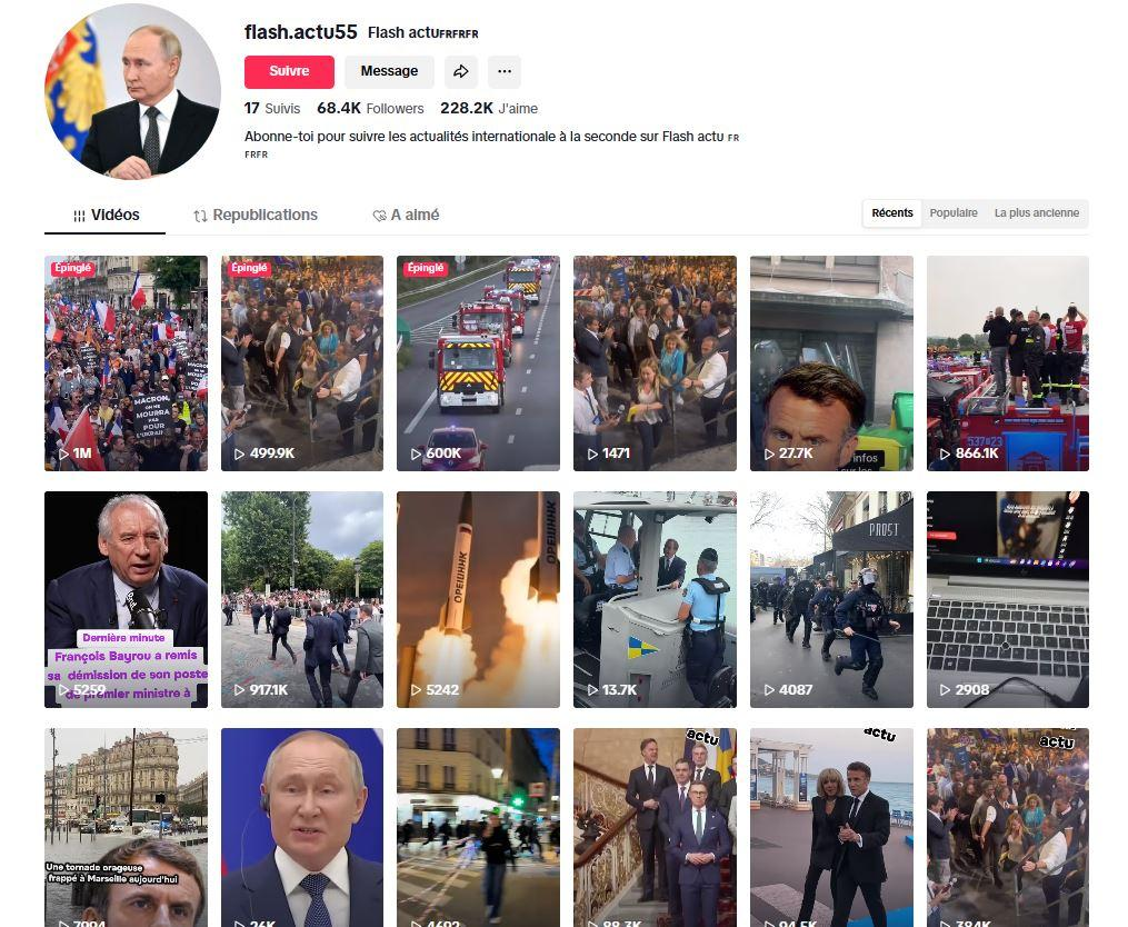 Créés dans les mois précédents pour la plupart, ces chaînes TikTok adoptent des pseudos et un semblant d'apparence rappelant les chaînes d'information en continu ou les médias en ligne : "Actumondial24", "MrActu", "Actugeopolitique"... et plaquent une voix off vraisemblablement générée par intelligence artificielle sur des extraits des journaux télévisés afin de crédibiliser leur récit.