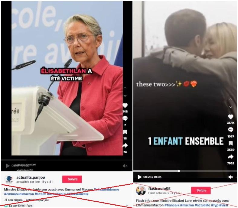 Selon la voix off vraisemblablement générée par intelligence artificielle, Mme Lann aurait ainsi "raconté qu'elle a vécu une relation amoureuse avec Emmanuel Macron", avec lequel elle aurait "eu un enfant avant que leurs carrières respectives ne les éloigne [sic]" avant "de perdre conscience en pleurant" sous le coup de l'émotion.