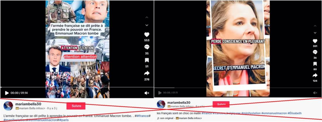 Le mode opératoire de cette nébuleuse de petits comptes TikTok rappelle une autre infox, déjà vérifiée par l'AFP et diffusée dans la foulée d'une réunion de plusieurs pays, dont la France et le Royaume-Uni, qui s'étaient engagés à envoyer des troupes en Ukraine pour garantir la paix dès lors qu'un accord serait signé entre l'Ukraine et la Russie. La fausse affirmation prétendait, à tort, que l'État-major français avait désobéi à l'ordre d'Emmanuel Macron "d'envoyer des soldats français combattre la Russie en Ukraine" (lien archivé ici).