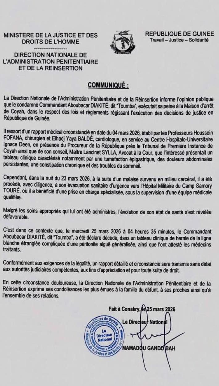 Le Commandant Aboubacar Diakité, connu sous le surnom de « Toumba », est décédé ce mercredi 25 mars 2026 à 04h35, à l’hôpital militaire du Camp Samory Touré de Conakry, a annoncé la Direction nationale de l’administration pénitentiaire et de la réinsertion à travers un communiqué officiel.