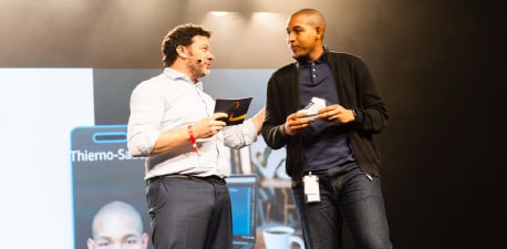 Sadou Bah recevant le prix “Just do it Award” des mains de Russell Grandinetti, SVP Amazon.