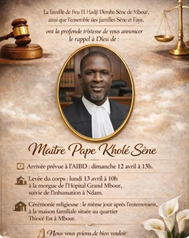 Le monde judiciaire sénégalais est en deuil. Maître Pape Demba Sène, avocat inscrit aux barreaux de Paris et de Dakar, est décédé dans la nuit du jeudi 9 avril 2026 à Paris.