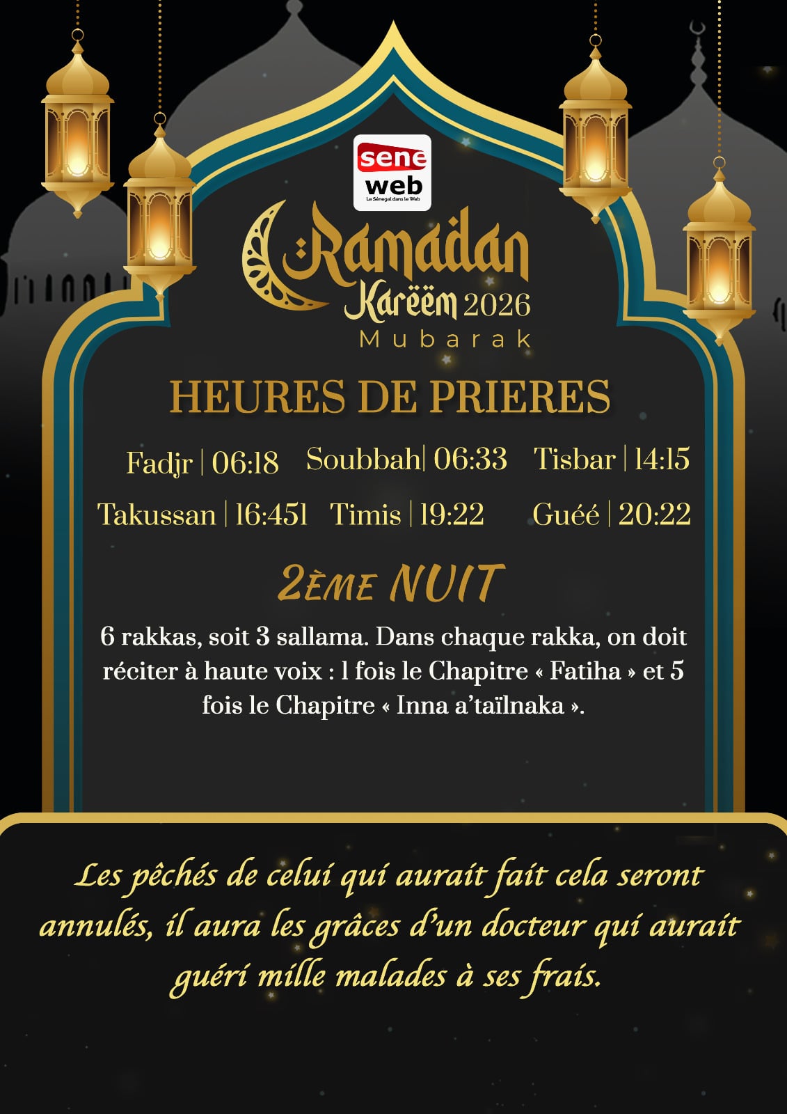 Le 19 février 2026 marque la 2ème nuit du mois sacré du Ramadan au Sénégal, une nuit propice à la purification spirituelle et à l’effacement des péchés. Selon les recommandations diffusées par Seneweb, cette nuit offre une opportunité de multiplier les actes d’adoration volontaires (nafila) avec une récompense divine particulièrement généreuse
