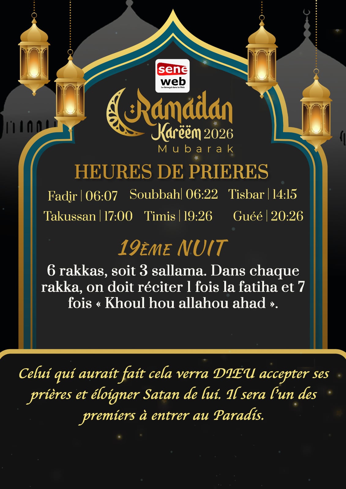 Le 8 mars 2026 marque la 19ème nuit du mois sacré du Ramadan au Sénégal, une nuit d’une grande valeur spirituelle selon les recommandations diffusées par Seneweb. Cette nuit est particulièrement mise en avant pour la promesse d’acceptation des prières, d’éloignement de Satan et d’une entrée privilégiée au Paradis.