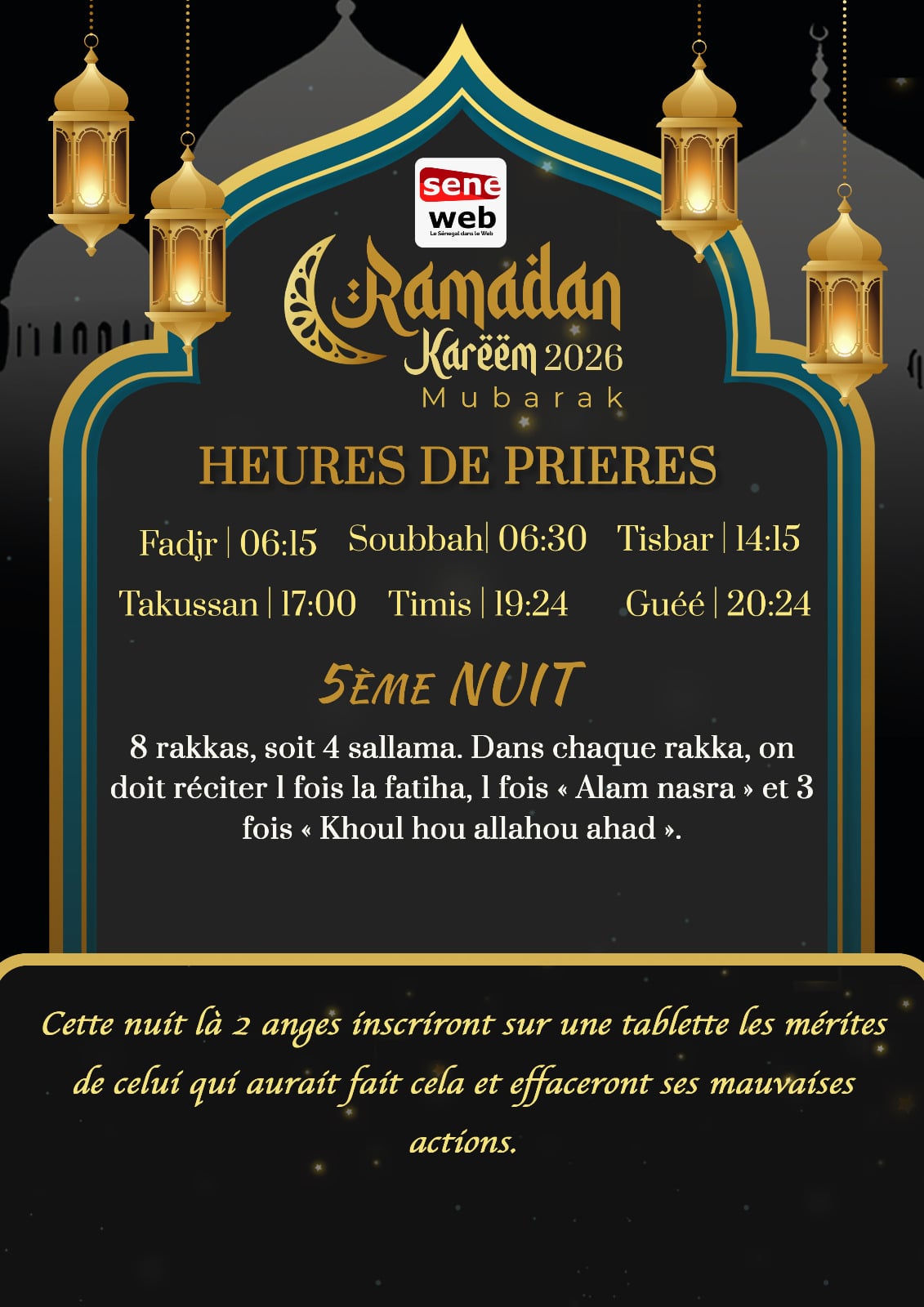 « Cette nuit-là, 2 anges inscriront sur une tablette les mérites de celui qui aurait fait cela et effaceront ses mauvaises actions. »Horaires des Prières au Sénégal (5ème jour de Ramadan 2026)