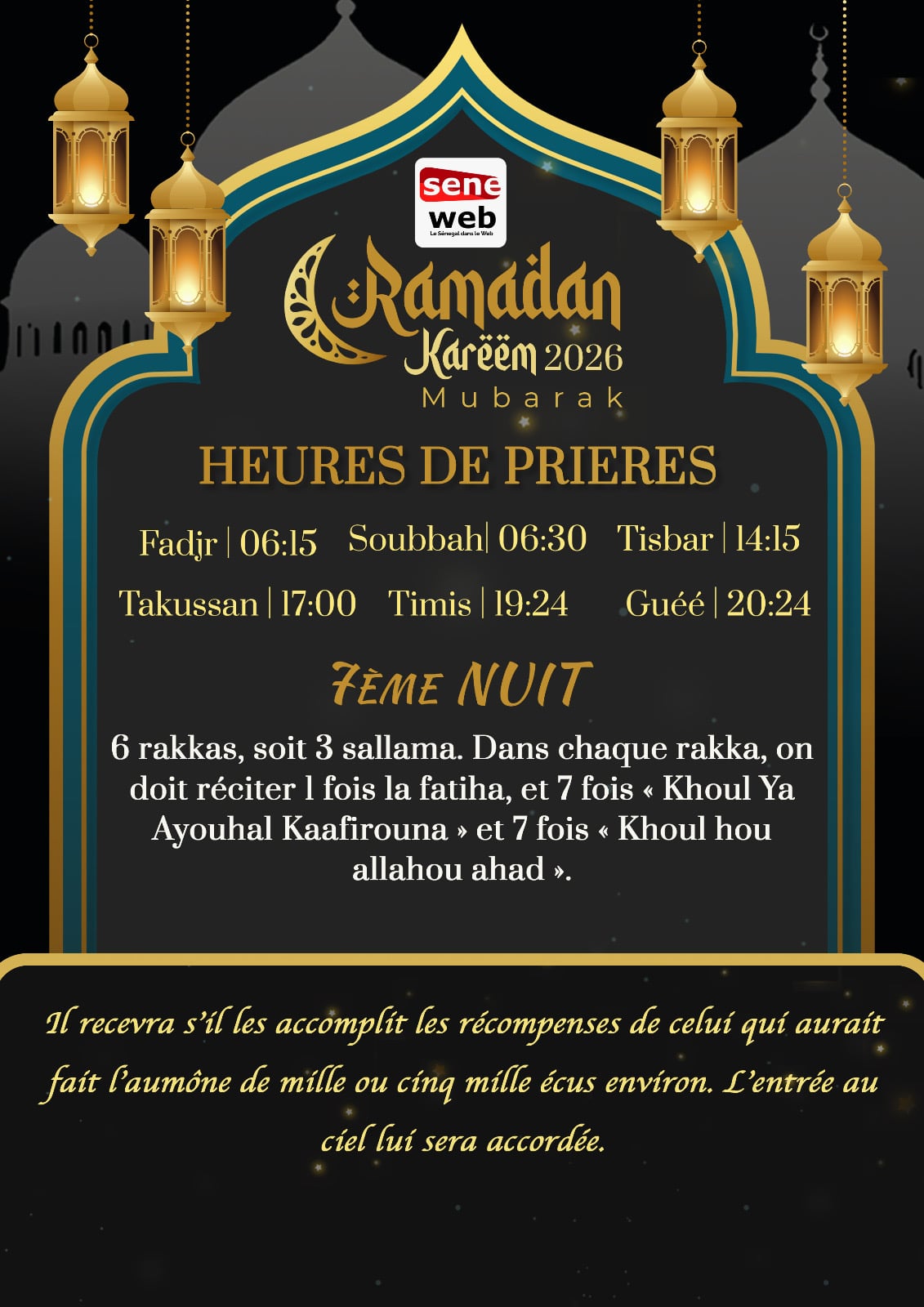Le 24 février 2026 marque la 7ème nuit du mois sacré du Ramadan au Sénégal, une nuit d’une grande importance spirituelle selon les recommandations partagées par Seneweb. Cette nuit est particulièrement mise en valeur pour la récompense exceptionnelle promise à ceux qui accomplissent la nafila recommandée.