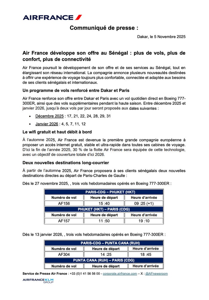 Air France poursuit le développement de son offre et de ses services au Sénégal, tout en élargissant son réseau international. La compagnie annonce plusieurs nouveautés destinées à offrir une expérience de voyage toujours plus confortable, connectée et adaptée aux besoins de ses clients sénégalais et internationaux.
