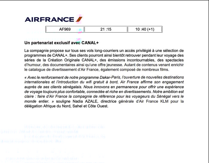 « Avec le renforcement de notre programme Dakar-Paris, l’ouverture de nouvelles destinations internationales et l’introduction du wifi gratuit à bord, Air France affirme son engagement auprès de ses clients sénégalais. Nous innovons en permanence pour offrir une expérience de voyage toujours plus confortable, connectée et riche en divertissements. Notre ambition est claire : faire d’Air France la compagnie de référence pour les voyageurs du Sénégal vers le monde entier. » souligne Nadia AZALE, directrice générale d’Air France KLM pour la délégation Afrique du Nord, Sahel et Côte Ouest.