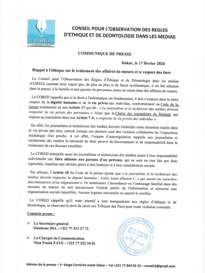 Dans un communiqué publié ce mardi 17 février 2026 à Dakar, le Conseil pour l’Observation des Règles d’Éthique et de Déontologie dans les médias (CORED) tire la sonnette d'alarme. L'instance d'autorégulation « constate avec regret » que des allusions systématiques sont faites dans la presse à la famille et aux parents de personnes mises en cause dans des dossiers de mœurs.