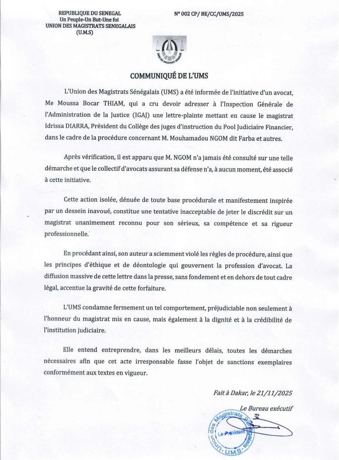 Le communiqué transmis à Seneweb a été signé à Dakar le 21 novembre 2025 par le Bureau exécutif de l'UMS.