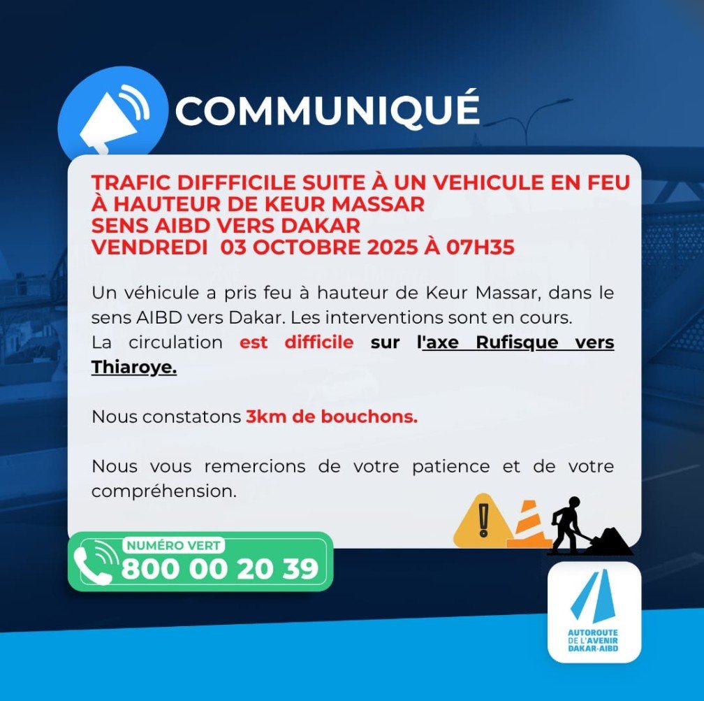 Un véhicule a pris feu ce matin à hauteur de Keur Massar, dans le sens AIBD vers Dakar, provoquant d'importantes perturbations sur l'axe Rufisque-Thiaroye. Les services d'intervention sont actuellement sur place pour gérer l'incident, mais la circulation reste difficile, avec environ 3 km de bouchons constatés. Les autorités appellent à la patience et à la prudence des usagers.