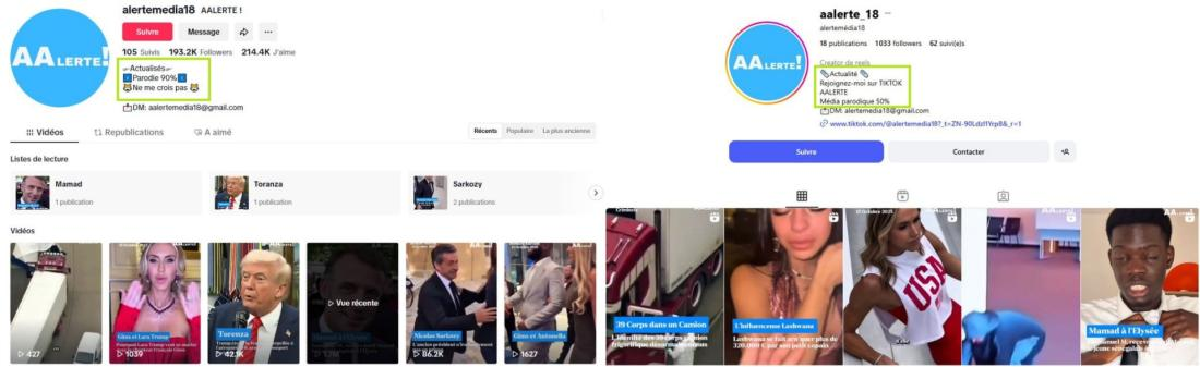 AFP Factuel a retrouvé les comptes TikTok et Instagram à l'origine de ces rumeurs. Par leur nom - "alertemédia18" - et le format de leurs contenus, ils imitent les codes de médias d'actualité, tout en diffusant de fausses informations. Une brève analyse de leur ligne éditoriale et de leurs contenus montre qu'il s'agit de sources peu fiables : leurs biographies indiquent même que leurs contenus relèvent de la "parodie à 50%" voire "90%", et vont jusqu'à inviter les internautes à "ne pas [les] croire".