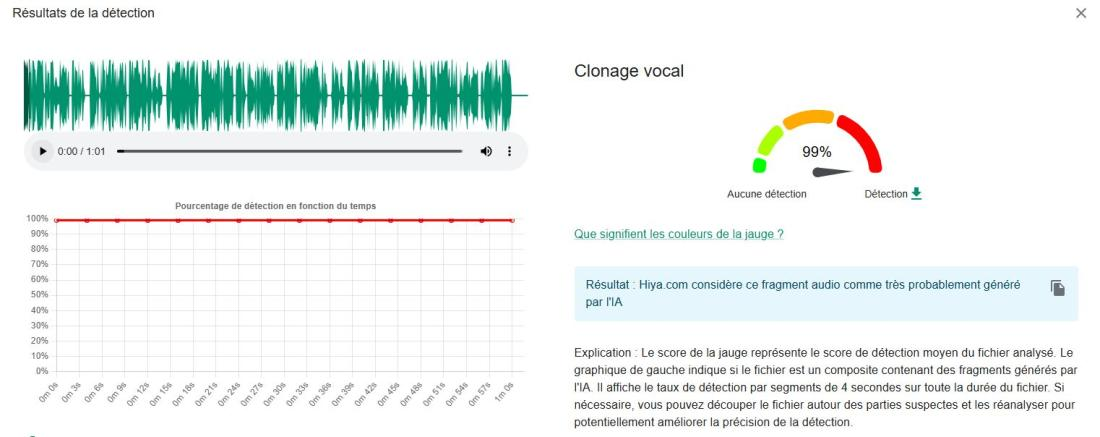 C'est le cas dans les vidéos inventant des dénouements à l'histoire de Mamadou Niang. Elles utilisent des images de l'étudiant et des présidents français et sénégalais trouvées sur les réseaux sociaux. Et l'audio accompagnant ces images a 99% de chances d'avoir été généré par IA, selon l'analyse du détecteur de deepfakes Hiya.com proposé par l'outil de vérification InVID-WeVerify.