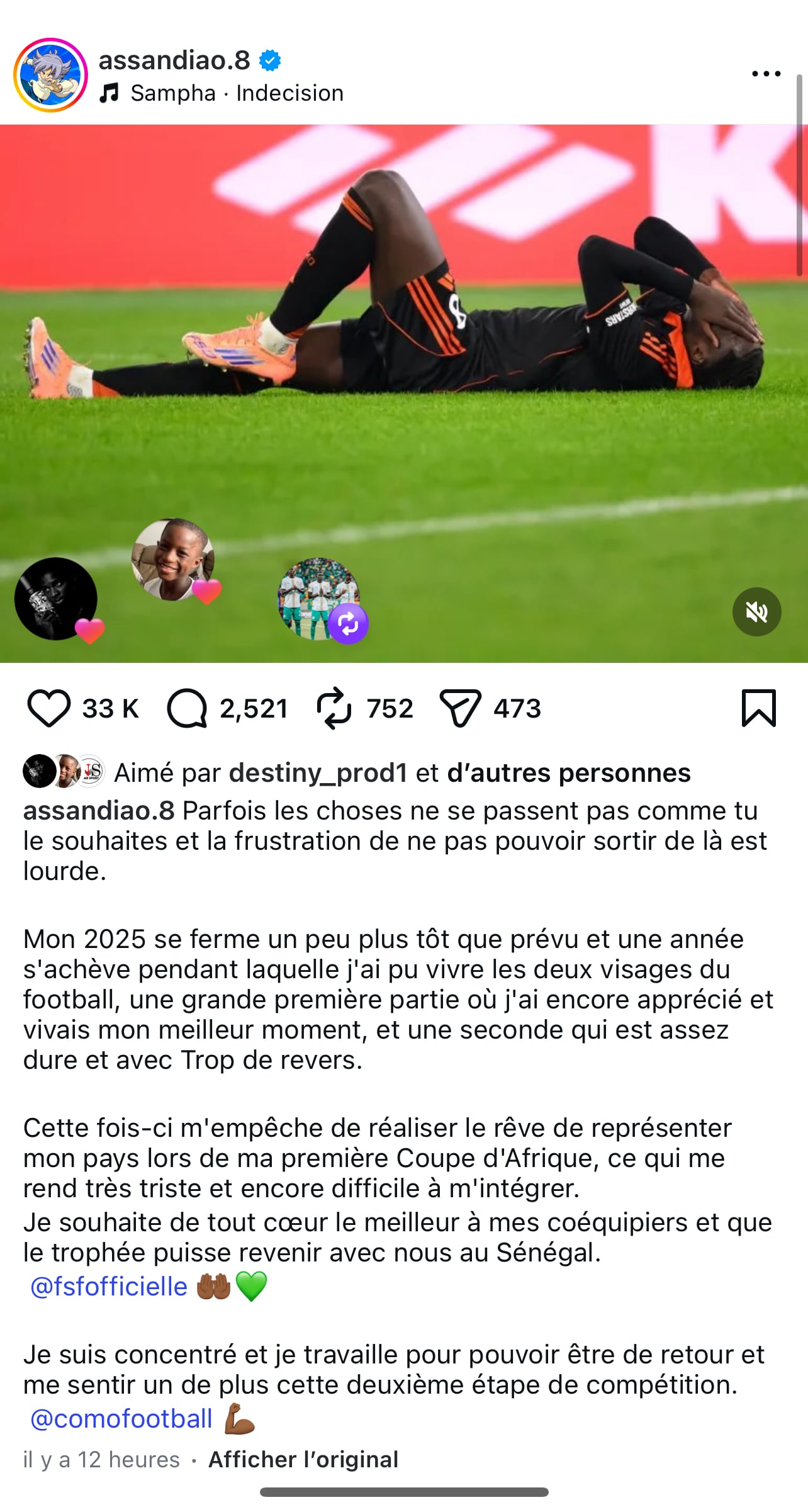 Sur son compte Instagram, le Lion est revenu avec émotion sur une année 2025 contrastée, marquée à la fois par des moments forts et des périodes difficiles. Malgré cette désillusion, le joueur a tenu à adresser un message de soutien et d’encouragement à ses coéquipiers, à qui il souhaite le sacre continental.