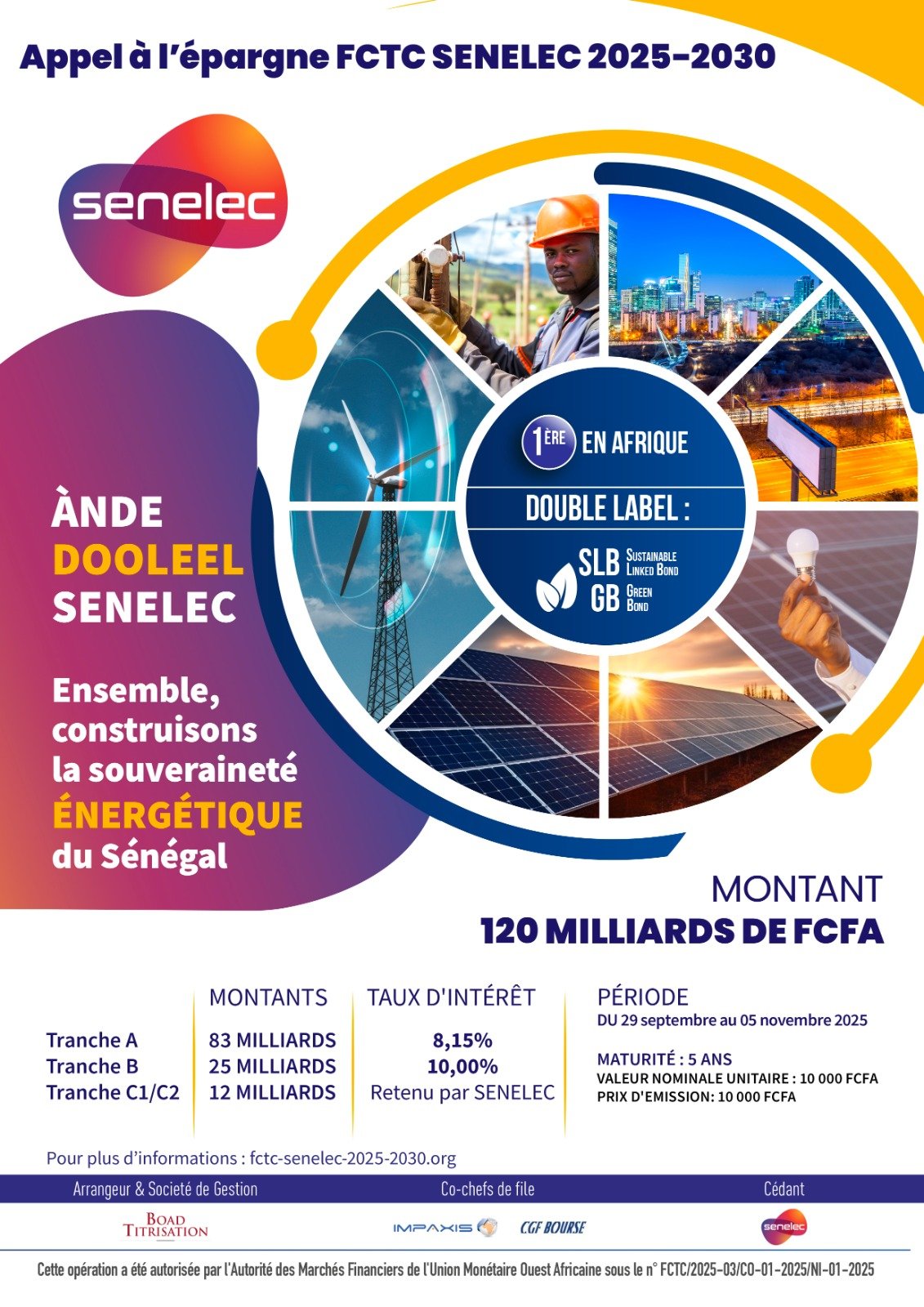 Avec cette émission, la Senelec et BOAD Titrisation redessinent les contours de la finance durable africaine. Pour les investisseurs, c’est l’opportunité de conjuguer rendement et responsabilité. Pour le Sénégal, c’est un levier stratégique afin de réaliser l’ambition d’un accès universel à l’électricité et d’une transition énergétique accélérée.