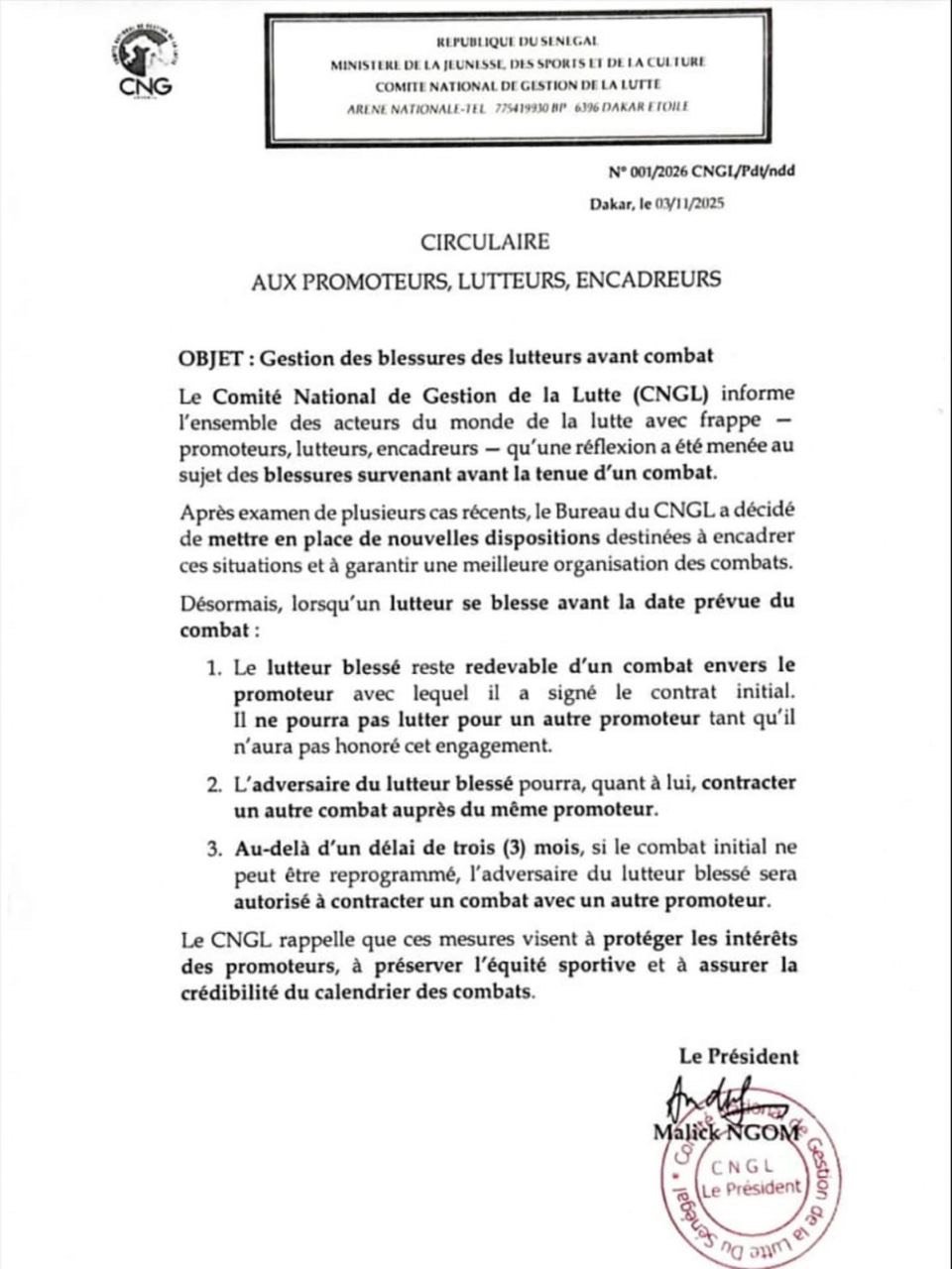 Selon le texte signé par le président du Cngl, Malick Ngom, désormais, tout lutteur blessé avant la date prévue de son combat demeure « redevable » de son engagement initial et ne pourra pas lutter pour un autre promoteur tant que ce contrat ne sera pas honoré.
