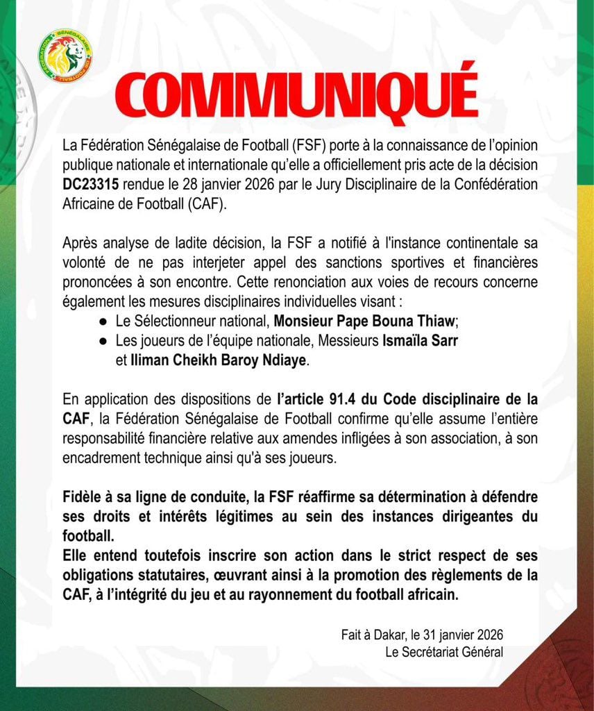 Dans un communiqué rendu public, ce samedi, l’instance fédérale indique avoir notifié à la CAF « sa volonté de ne pas interjeter appel des sanctions sportives et financières prononcées à son encontre ». Cette renonciation, précise la FSF, « concerne également les mesures disciplinaires individuelles » visant le sélectionneur national Pape Bouna Thiaw ainsi que les joueurs Ismaïla Sarr et Iliman Cheikh Baroy Ndiaye.