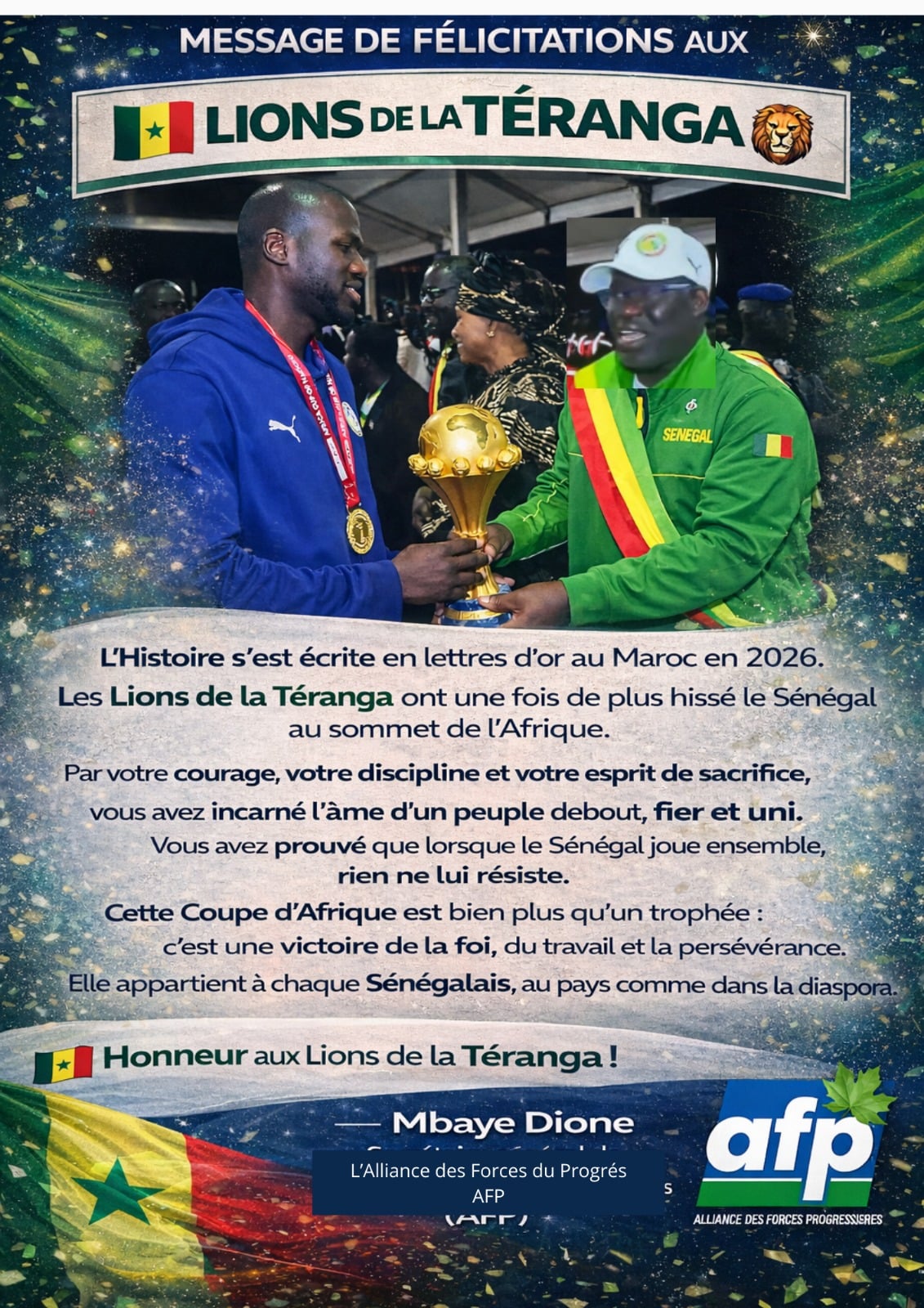 Dans ce contexte de liesse nationale, Mbaye Dione, Secrétaire général de l’Alliance des Forces de Progrès (AFP) et maire de Ngoundiane, a tenu à adresser ses félicitations. Dans son message, il souligne la portée symbolique de cette victoire :