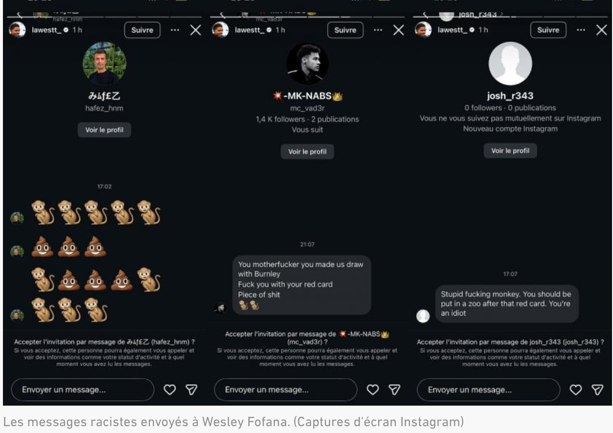 Les messages racistes envoyés à Wesley Fofana. (Captures d'écran Instagram)