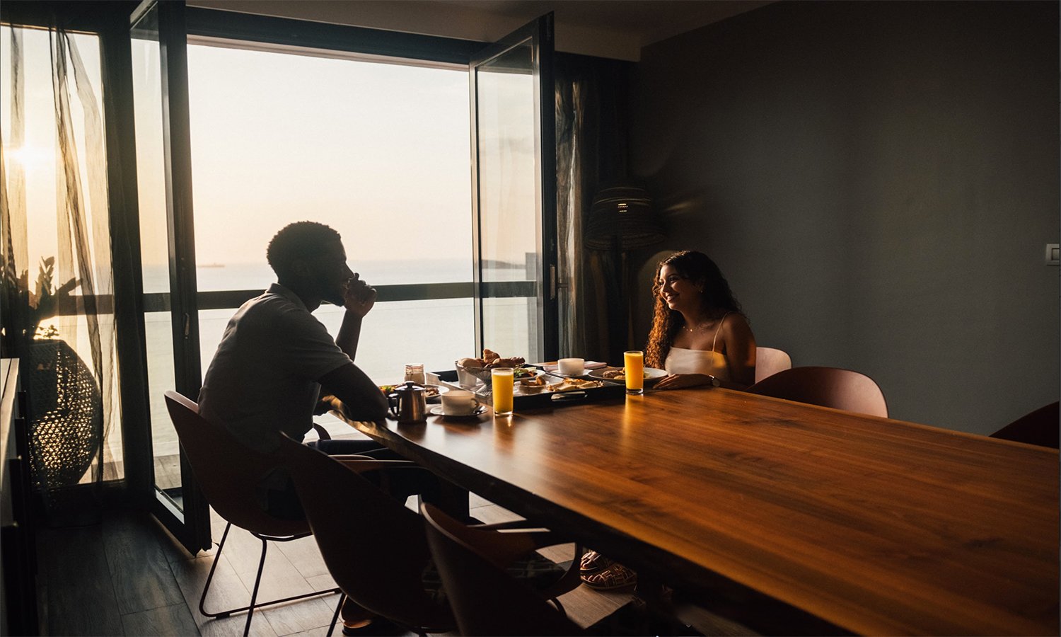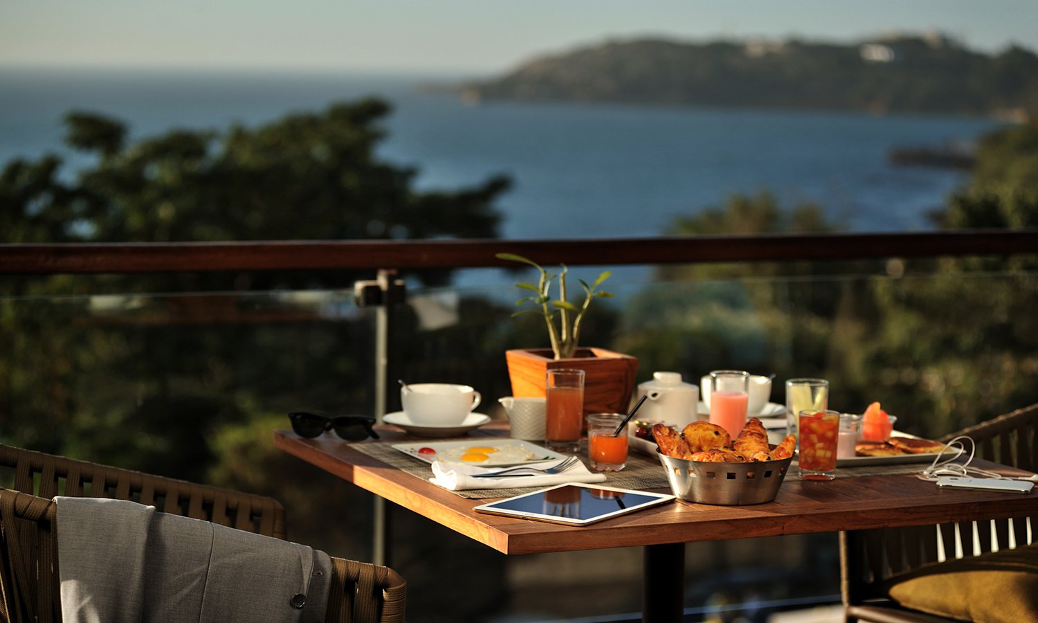 L’orientation se confirme à mesure que le parcours se poursuit vers la zone de restauration. Premier repas de la journée, le petit-déjeuner est un élément stratégique de l’établissement et pour leurs convives, ils mettent les petits plats dans les grands. La carte propose au moins 20% d’options vegan. Les pains sont confectionnés sur place, avec des variétés sans gluten. Les buffets froids rassemblent des produits issus de fermes locales, dont le fromage est livré par une ferme bio sénégalaise, située à Sangalkam et fournisseur de l'hôtel depuis une dizaine d'années. Un espace « healthy » met en avant des jus pressés à froid, des eaux détox et une sélection de laits qui répond à différents régimes alimentaires.