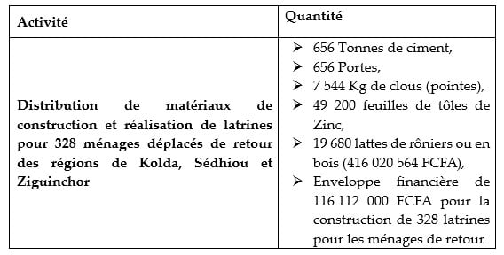 En 2025, 328 ménages déplacés de retour ont bénéficié d’un appui direct à la réinstallation dans les régions de Ziguinchor, Sédhiou et Kolda. Des centaines de tonnes de ciment, des dizaines de milliers de tôles, des portes, des lattes, des clous, mais aussi 328 latrines familiales, ont été distribuées pour permettre la construction d’habitats permanents, décents et salubres. Derrière ces chiffres, ce sont autant de familles qui quittent enfin les abris de fortune pour retrouver l’intimité et la sécurité d’un vrai foyer.