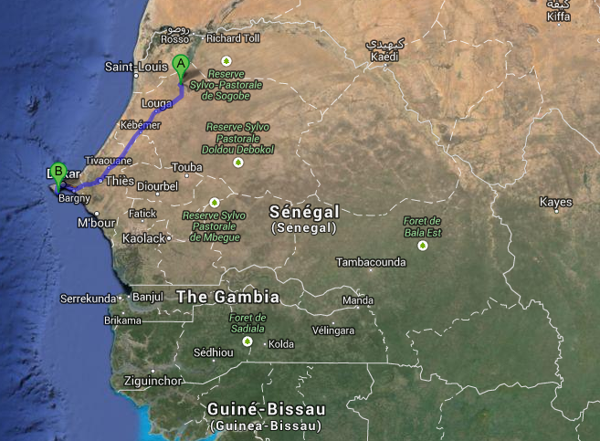 La distance entre les deux sites : De Keur Momar Sarr dans la région de Louga au Nord à Dakar la pointe Ouest du Pays. |