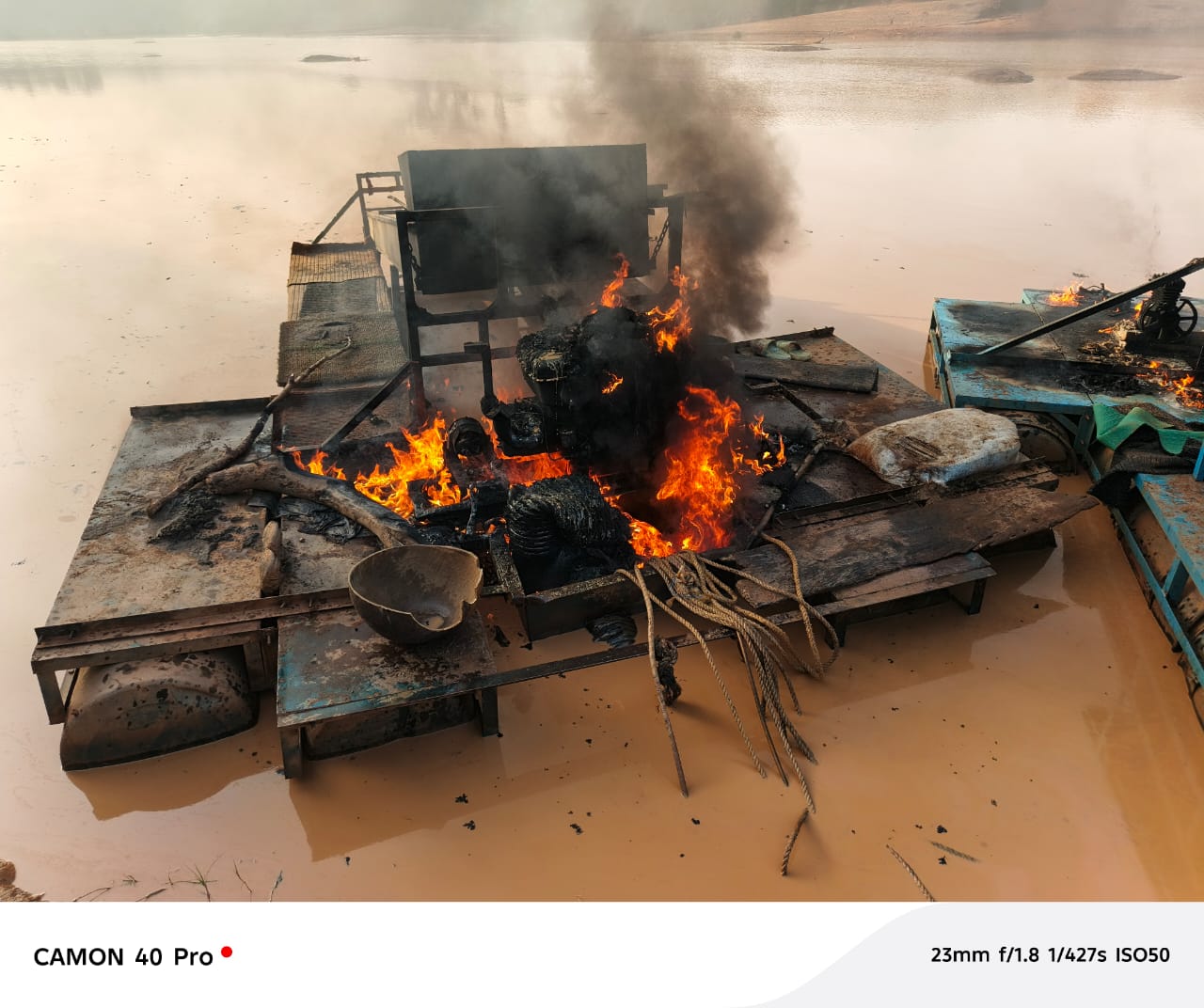 Arrivés sur les lieux indiqués, les éléments du détachement, basés en poste avancé à Saeinsoutou, ont procédé à une opération de destruction de quatre dragues.