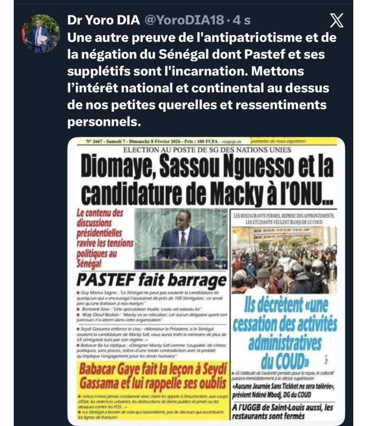 L'ancien ministre et conseiller en communication, le Dr Yoro Dia, a vivement réagi sur le réseau social X à l'opposition manifestée par des figures de Pastef concernant une possible candidature de Macky Sall au poste de Secrétaire général des Nations Unies.