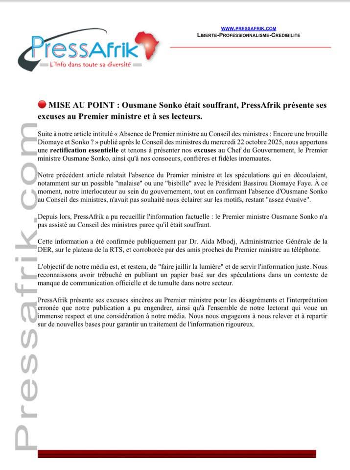 Le média en ligne PressAfrik a publié un communiqué intitulé « MISE AU POINT » pour présenter ses « excuses sincères » au Premier ministre Ousmane Sonko et rectifier une information erronée concernant son absence au Conseil des ministres du mercredi 22 octobre 2025.