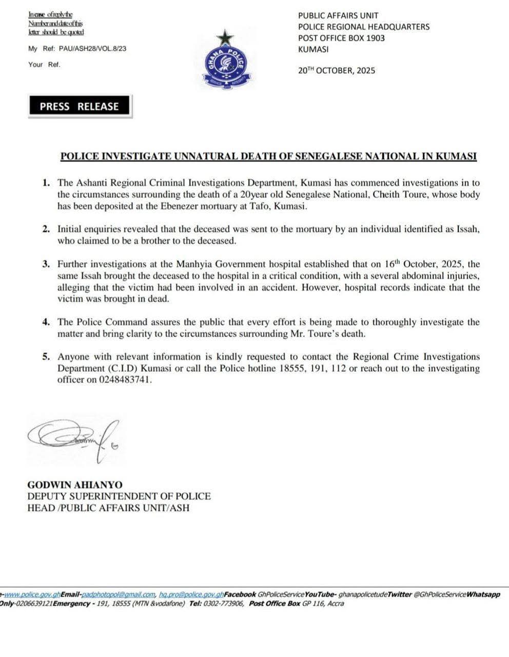 La police ghanéenne a publié un communiqué ce 20 octobre 2025 annonçant l'ouverture d'une enquête sur les circonstances entourant le décès de Cheikh Touré, un jeune ressortissant sénégalais de 20 ans. Le corps de la victime a été déposé à la morgue Ebenezer de Tafo, à Kumasi.