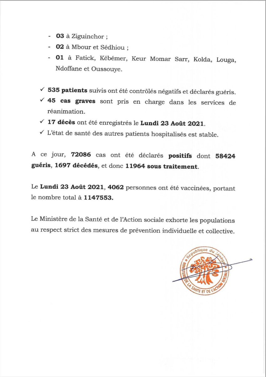 Depuis le 2 mars 2020, le Sénégal a répertorié 72086 cas positifs au coronavirus dont 58424 personnes guéries, 1697 décédés, 1 évacué (finalement décédé en France). Donc, ils sont 11964 malades sous traitement. Le nombre total de personne vaccinées est de 1 147 553. Sur ce, le ministère de la Santé et de l’Action sociale exhorte davantage les populations au respect strict des mesures de prévention individuelles et collectives.