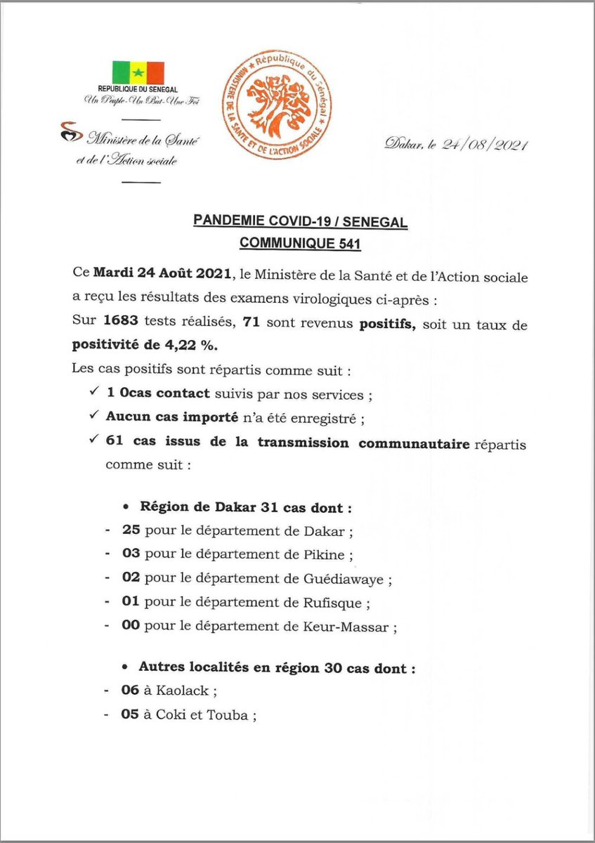 Ainsi, selon le communiqué numéro 541 sur l’évolution de la pandémie de la Covid-19 au Sénégal, du ministère de la Santé et de l’Action sociale, un taux de positivité de 4,22% est relevé suite à ces résultats issus des examens virologiques.