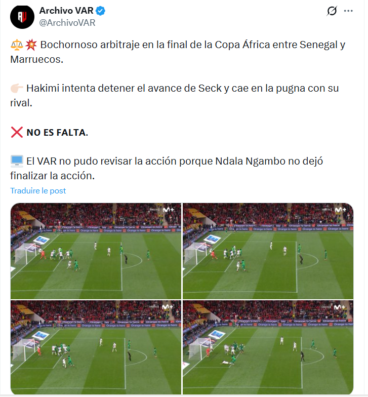 "Arbitrage honteux lors de la finale de la Coupe d'Afrique entre le Sénégal et le Maroc. Hakimi tente d'arrêter l'avancée de Seck et tombe dans la lutte avec son rival. CE N'EST PAS UNE FAUTE. La VAR n'a pas pu examiner l'action car Ndala Ngambo n'a pas permis à l'action de se terminer", écrit Archivo VAR.