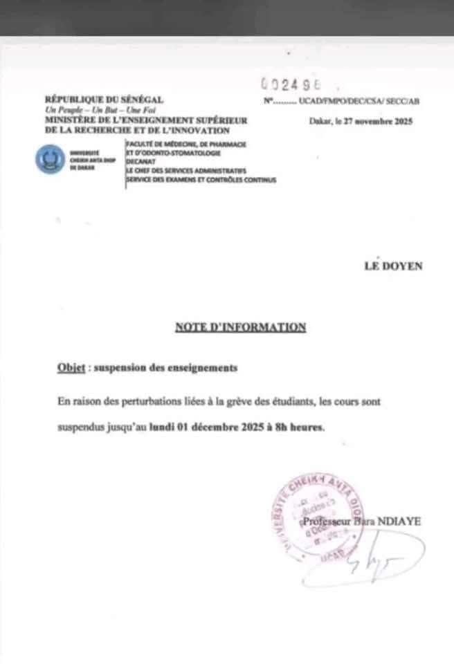 que les cours à l’UCAD sont suspendus jusqu’au 1er décembre en raison des perturbations liées aux grèves étudiantes.