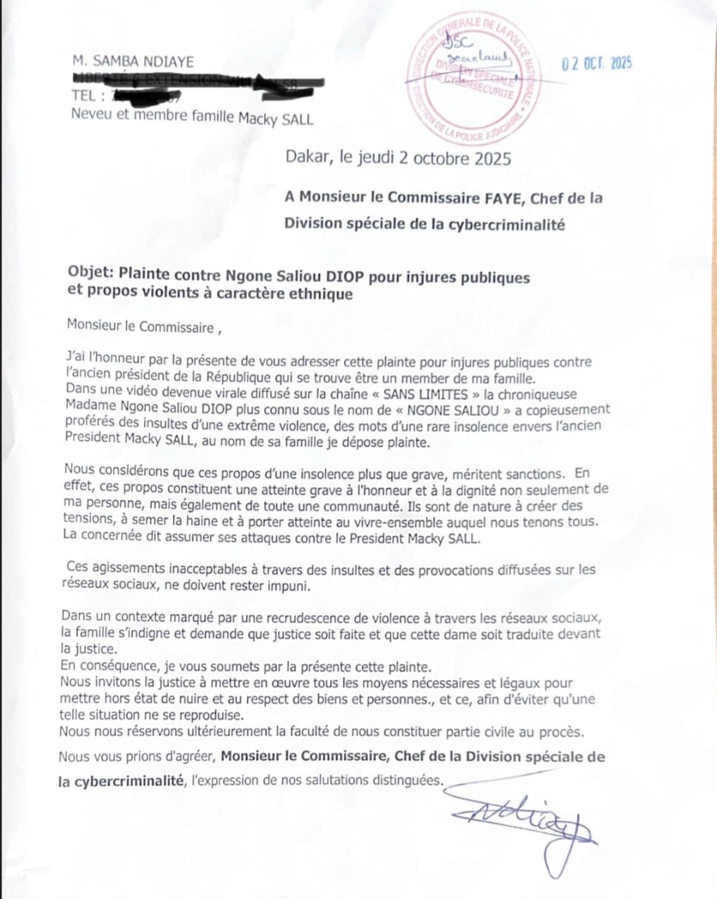 La famille de l'ancien président Macky Sall a décidé de saisir la justice suite aux propos tenus par la chroniqueuse Ngoné Saliou Diop. Une plainte pour injures publiques et propos violents à caractère ethnique a été déposée ce mercredi à la Division spéciale de la cybercriminalité, d'après le document parcouru par Seneweb.