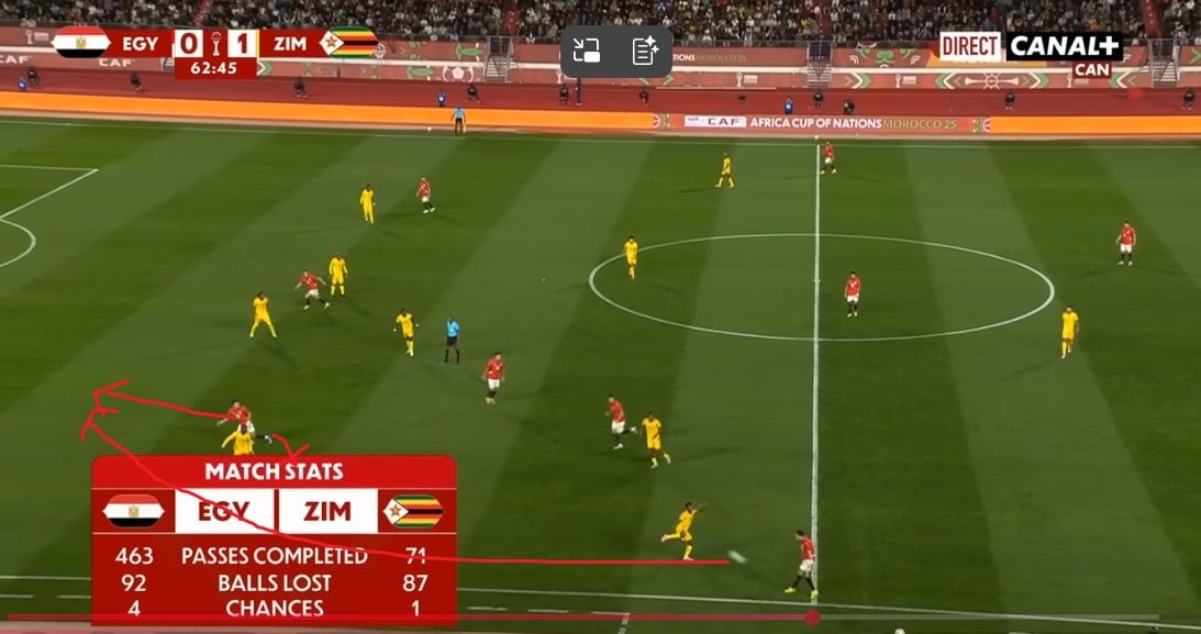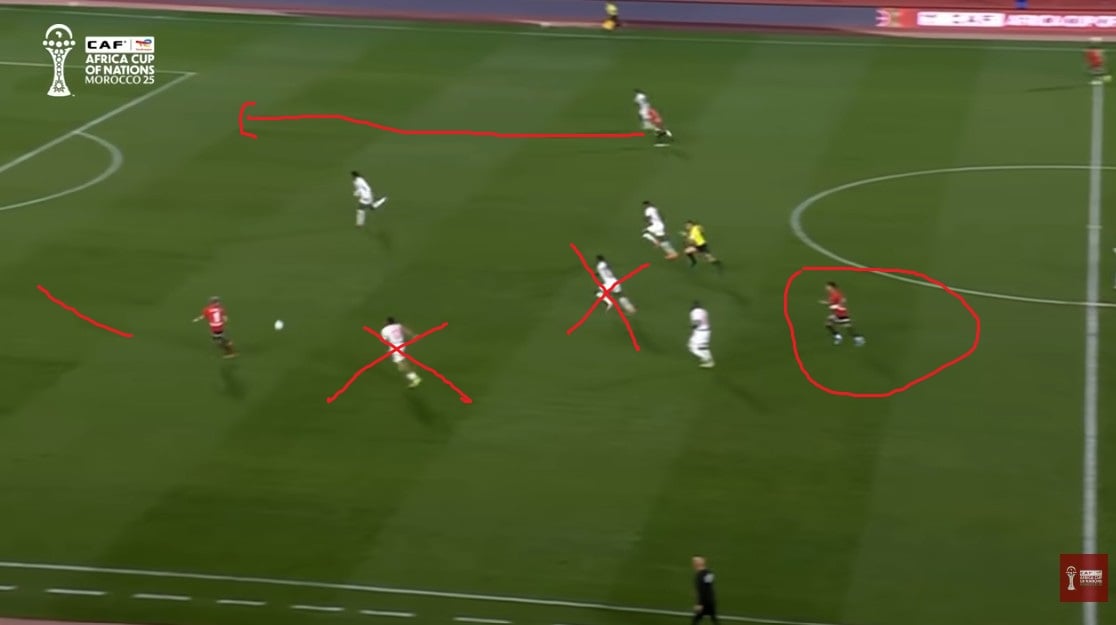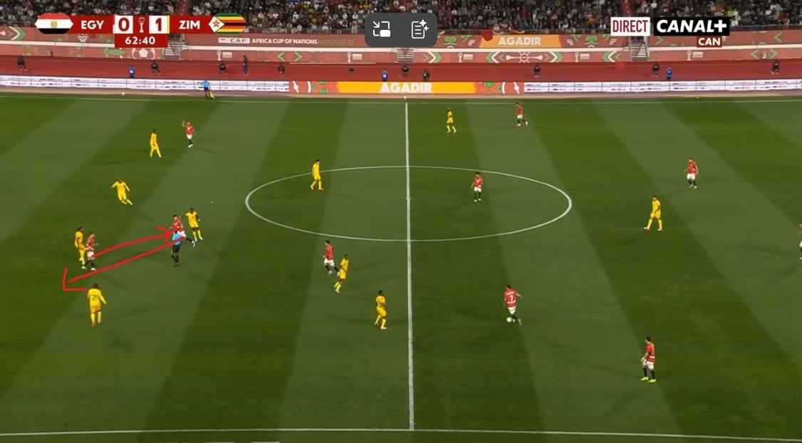 Le premier but égyptien dans cette compétition a été marqué de cette façon. Sur ce but, c'est Marmoush qui a été trouvé derrière la défense, face au Zimbabwe, sur l'égalisation. La course du joueur de Manchester City a été permise par le déplacement intelligent de Mostafa Mohamed, qui s'est recentré, aspirant le défenseur central censé couvrir l'axe droit. .