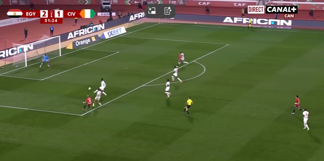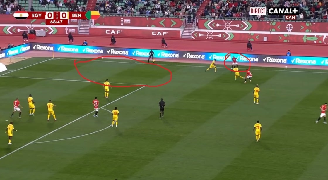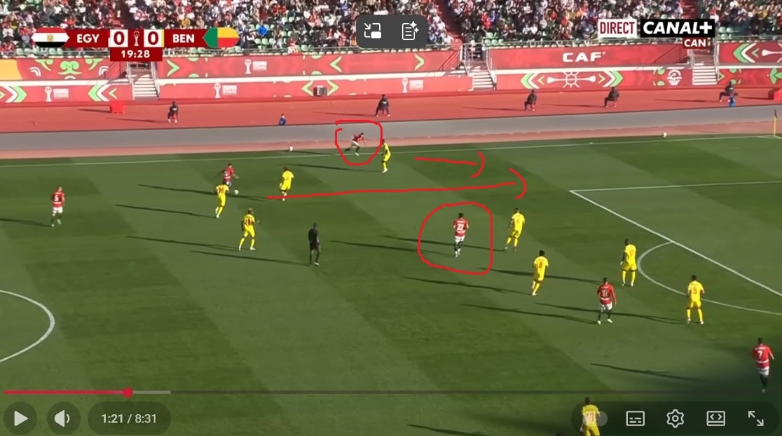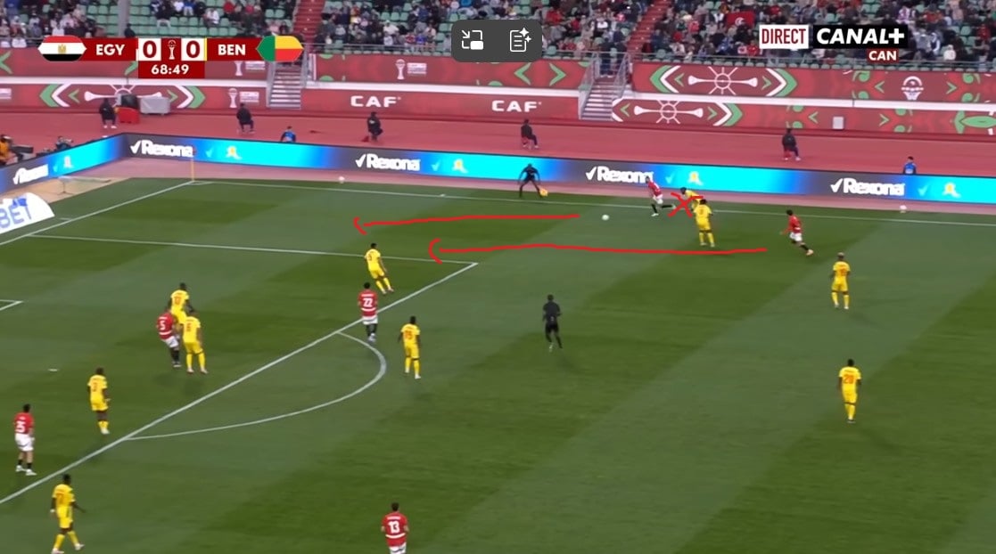 Peu avant ce but, la première occasion égyptienne a été créée de la même manière, à gauche cette fois-ci. Sur l'action, c'est Marmoush qui a décroché, créant un trou dans la défense exploité par le latéral gauche Mohamed Hamdi. Ce dernier centre pour Salah, mais contré in-extremis par la défense béninoise.
