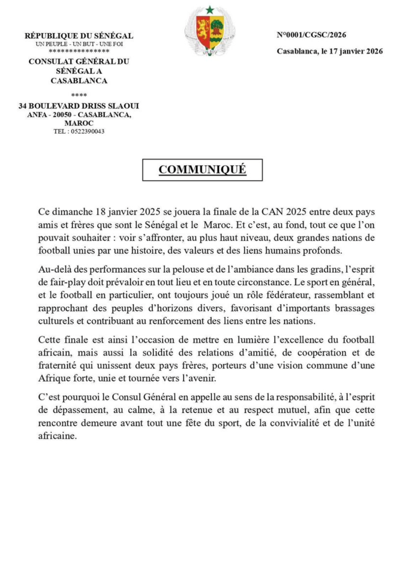 Dans un communiqué publié ce dimanche, le consul général du Sénégal au Maroc a appelé à la retenue et à la responsabilité, à l’approche de la finale de la CAN-2025 opposant le Sénégal au Maroc, prévue ce dimanche soir à Rabat.