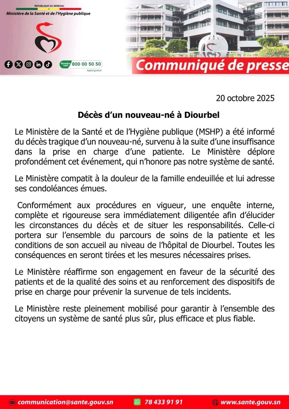 Le ministère de la Santé et de l’Hygiène publique a annoncé, ce lundi 20 octobre 2025, l’ouverture d’une enquête interne après le décès tragique d’un nouveau-né à l’hôpital de Diourbel.