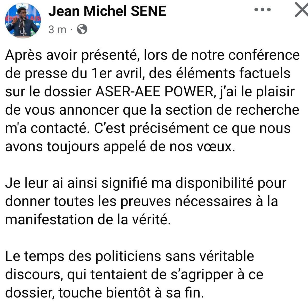 Dossier ASER–AEE Power : Jean-Michel Sène se dit prêt à collaborer avec la SR de Colobane