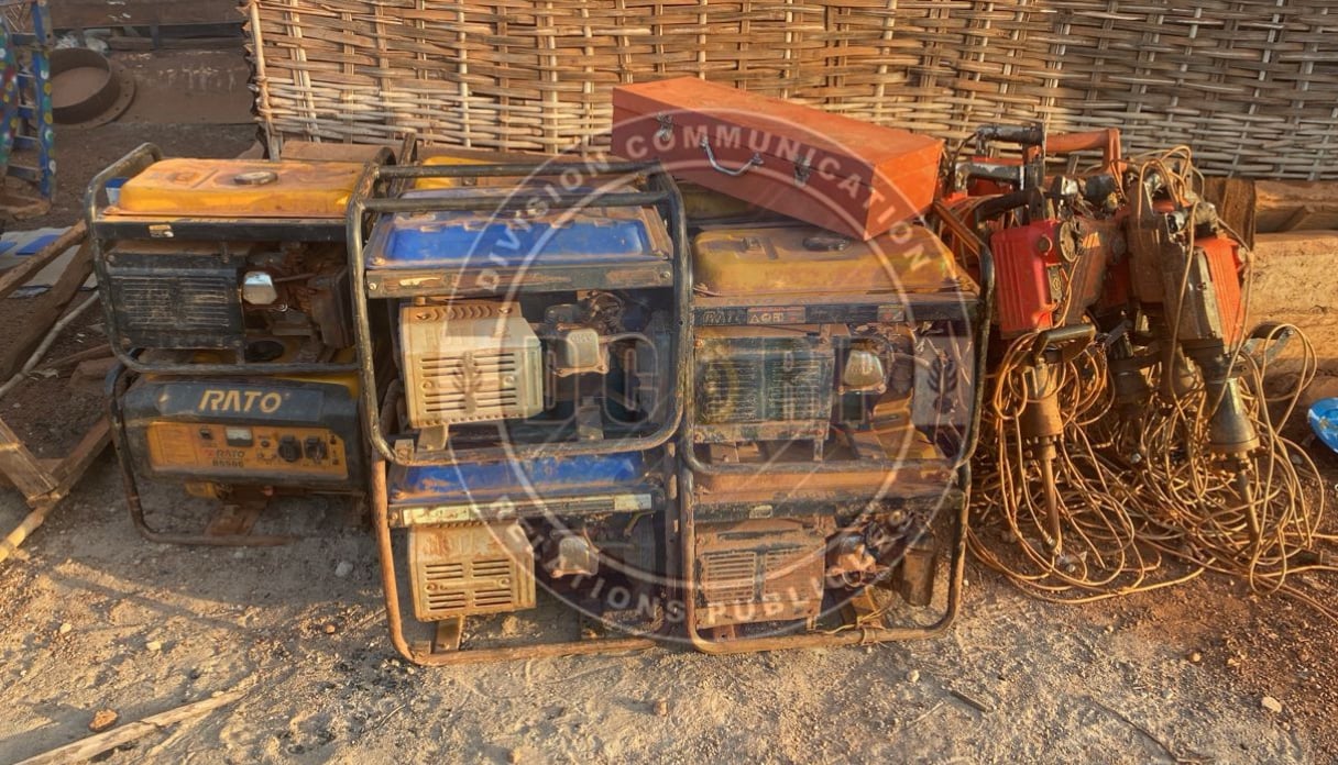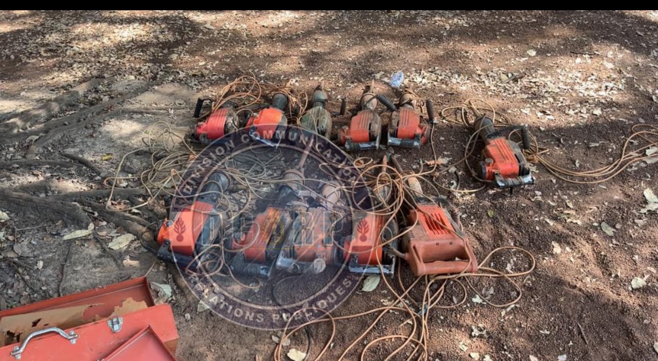 Un site d'orpaillage illégal a été démantelé et seize individus interpelés. Un important arsenal utilisé pour l'exploitation clandestine a également été saisi. Il comprend dix groupes électrogènes, dix marteaux-piqueurs, neuf tricycles « piki-paka », six motos et sept téléphones portables. Quatre machines cracheuses ont été détruites sur place, rendant le site définitivement inutilisable.