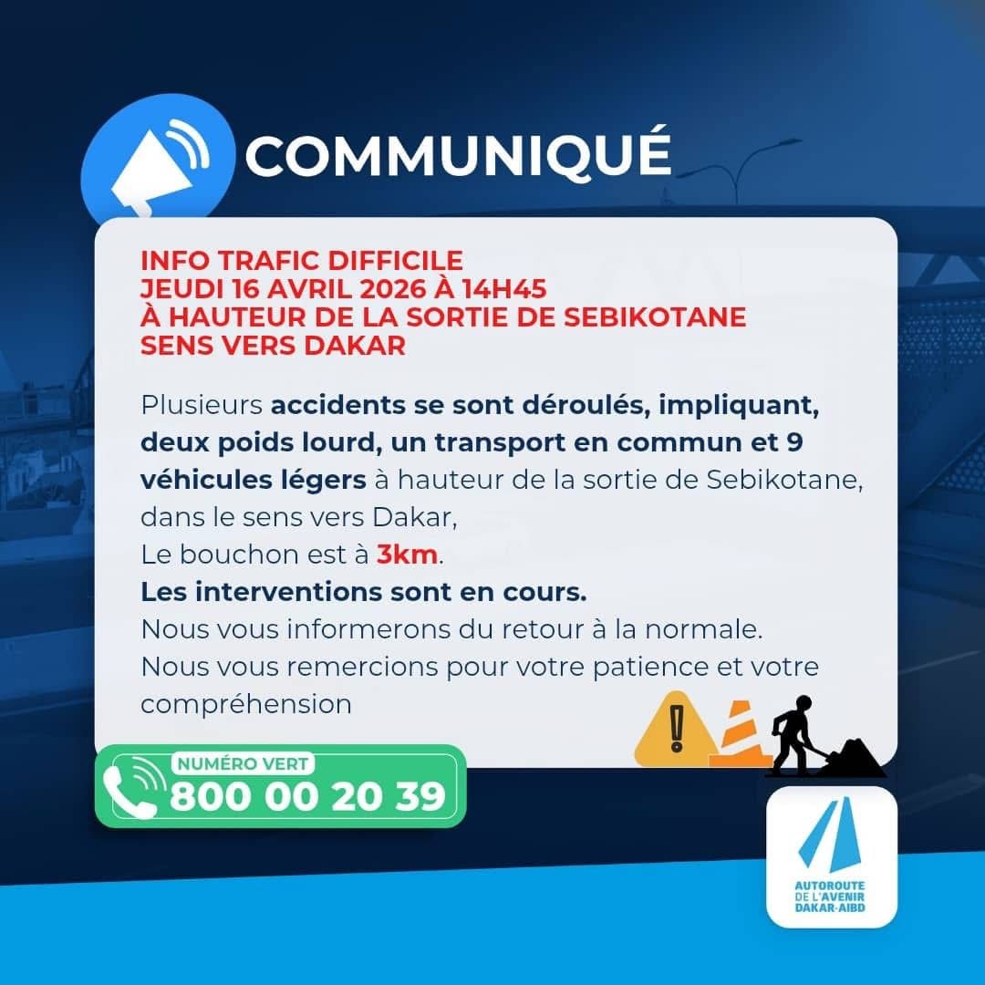Les usagers de l'autoroute à péage doivent s'armer de patience, ce jeudi 16 avril 2026. L'Autoroute de l'Avenir a signalé une situation de trafic particulièrement difficile à partir de 14h45, localisée précisément à hauteur de la sortie de Sébikotane dans le sens allant vers Dakar.