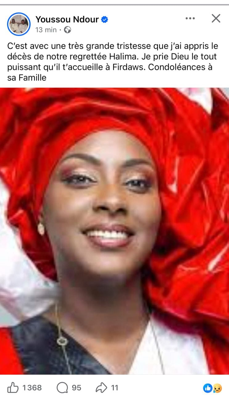 Le chanteur et homme politique sénégalais, Youssou Ndour, a exprimé sa tristesse suite au décès de Halima Gadji.