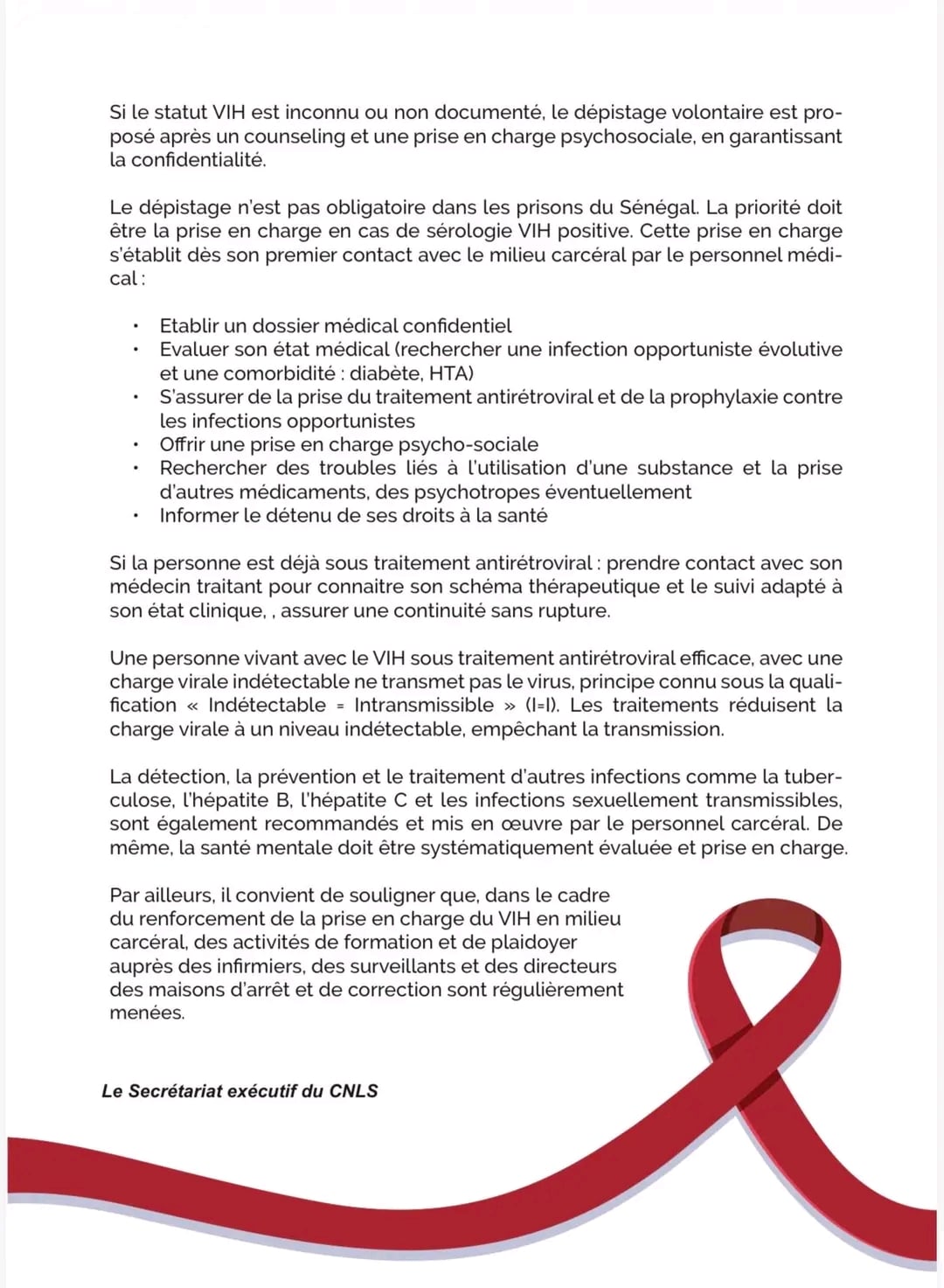Le CNLS rappelle enfin que des activités de formation et de plaidoyer sont régulièrement organisées auprès des infirmiers, des surveillants et des directeurs des maisons d'arrêt et de correction, afin de renforcer la prise en charge du VIH dans les prisons sénégalaises.