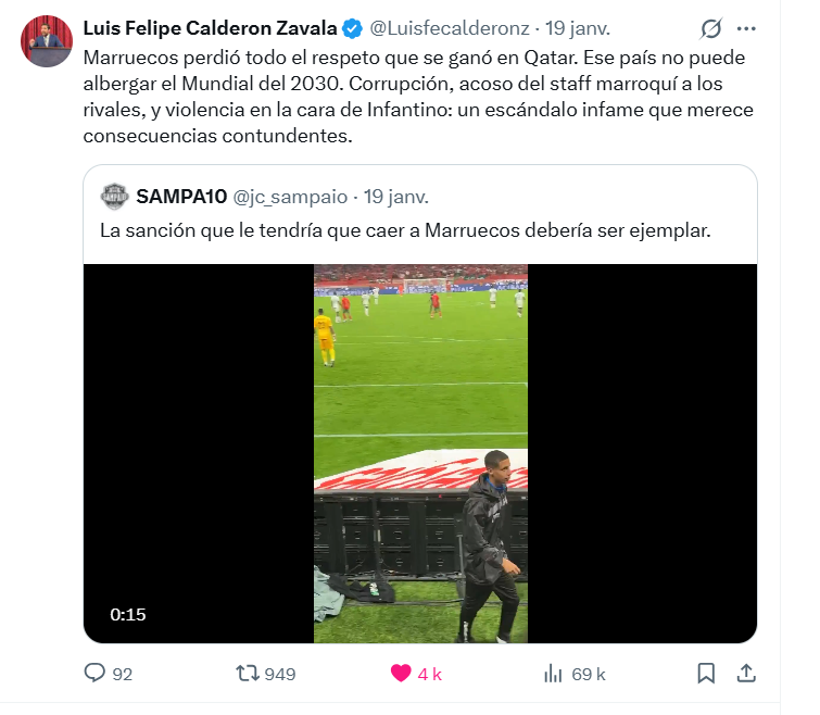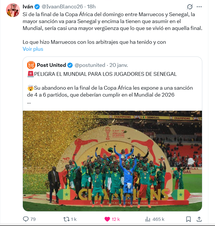 Ce n'est pas tout. Sur les réseaux sociaux, des journalistes espagnols se sont aussi indignés des images ridicules qui circulent, notamment les vols de serviettes par des ramasseurs, des officiels et même des joueurs. Plusieurs d'entre eux ont réclamé des sanctions contre le Maroc. "L'image du Maroc en tant que pays hôte de la Coupe d'Afrique des Nations n'aurait pas pu être pire. La FIFA va-t-elle intervenir ? J'en doute", écrit Alejandro Lopez Fernandez sur X. Pour Ivan Blanco, influenceur madrilène, ce serait une honte si le Sénégal est sanctionné plus sévèrement que le Maroc. "Si, lors de la finale de la Coupe d'Afrique des Nations dimanche entre le Maroc et le Sénégal, la sanction la plus lourde est infligée au Sénégal et qu'il doit la purger lors de la Coupe du monde, ce serait presque plus honteux que ce qui s'est passé lors de cette finale. Ce qu'a fait le Maroc avec les décisions arbitrales et l'incident de la serviette... Cela devrait clairement entraîner une sanction à la Coupe du Monde", fait-il savoir.