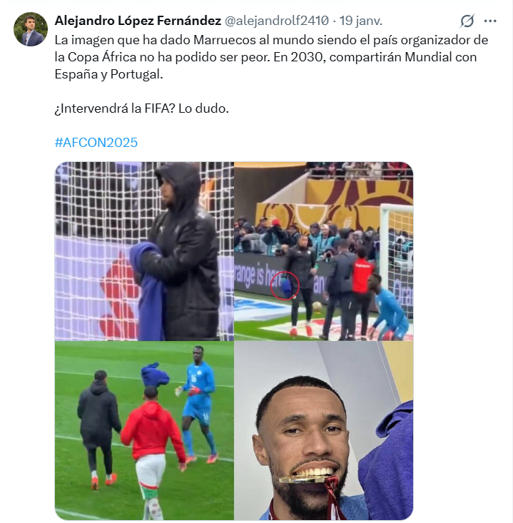 El Espanol, un autre média ibérique, a aussi été critique envers l'arbitrage en faveur du Maroc durant cette finale. "Contre le Sénégal, tout s’est effondré en quelques minutes. À la 95e minute, l’arbitre congolais Jean-Jacques Ndala Ngambo a refusé une tête légitime d’Ismaila Sarr suite à une poussée d’Abdoulaye Seck sur Achraf, ce qui a laissé de nombreux doutes lors des ralentis", peut-on lire. Le journal espagnol ajoute : "Ce qui promettait d’être une préparation triomphante (pour le Mondial 2030) s’est transformé en une vague de critiques sans précédent. La finale contre le Sénégal s’est non seulement terminée par une défaite, mais aussi par un chaos qui a laissé des images embarrassantes et des accusations de favoritisme arbitral qui hanteront le pays nord-africain durant les prochaines années".