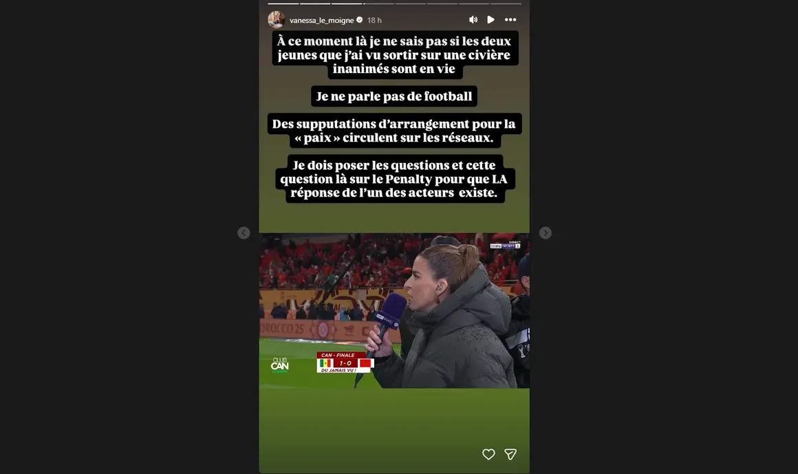 Présente sur la pelouse du stade Prince Moulay Abdallah aux côtés des consultants de la chaine qatarie, Vanessa Le Moigne a été la cible de violentes critiques pour avoir évoqué avec le gardien sénégalais les violents affrontements en tribune ainsi que la question d’un possible arrangement à propos du penalty de Brahim Diaz. "A ce moment là, je ne sais pas si les deux jeunes que j’ai vu sortir en civière inanimés sont en vie", explique-t-elle dans une story Instagram. "Je ne parle pas de football. Des supputations d’arrangements pour la "paix" circulent sur les réseaux. Je dois poser les questions et cette question là sur le penalty pour que LA réponse de l’un des acteurs existe."